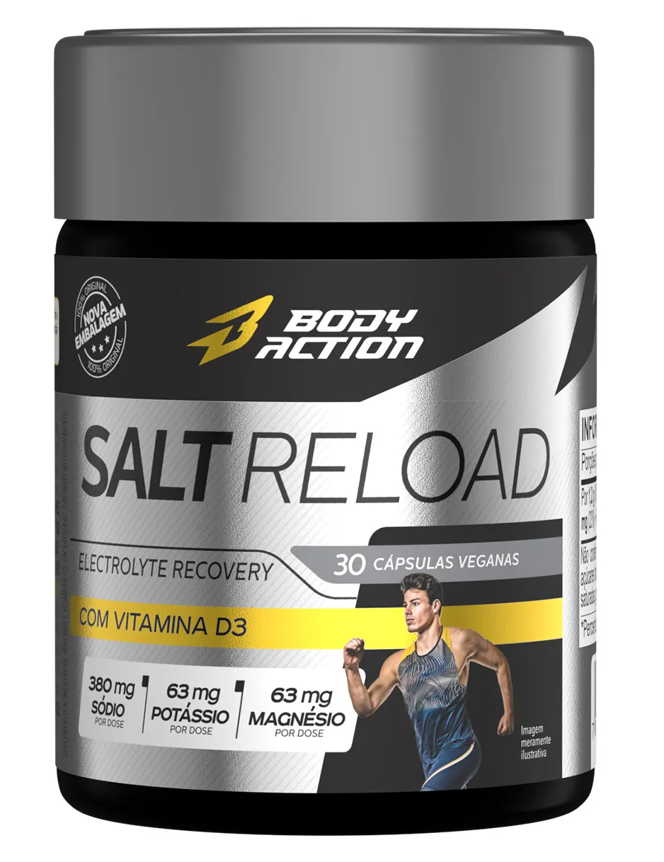 Reposição eletrolítica de alta performance para endurance. O Salt Reload da Body Action foi desenvolvido para atletas de longa duração, como ciclistas e corredores, que enfrentam perda intensa de sódio, potássio, magnésio e cálcio durante treinos e provas. Sua fórmula balanceada auxilia na prevenção de cãibras, melhora a contração muscular e otimiza a hidratação celular. Em cápsulas práticas, é ideal para uso antes, durante ou após atividades prolongadas.